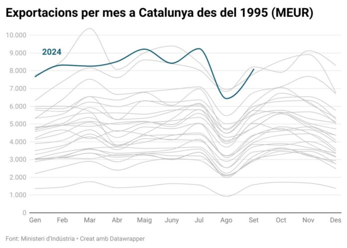 Les exportacions catalanes van pujar un 3,4% interanual el setembre després del descens del 7,3% de l’agost i van marcar la segona dada més alta dels registres del mes, segons les dades del Ministeri d’Indústria, Comerç i Turisme. En total, Catalunya va exportar béns a l’estranger per valor de 8.089,8 milions d’euros. L’únic setembre amb un millor resultat d’exportacions va ser el del 2022, en el qual es va vendre a l’exterior per valor de 8.220,7 milions. Durant el setembre de l’any passat el total exportat es va quedar en 7.823,3 milions. En canvi, les vendes a l’exterior de les empreses continuen arrossegant descensos en l’acumulat anual. Entre gener i setembre, les exportacions van caure un 2,9% interanual, fins als 74.182,9 milions.