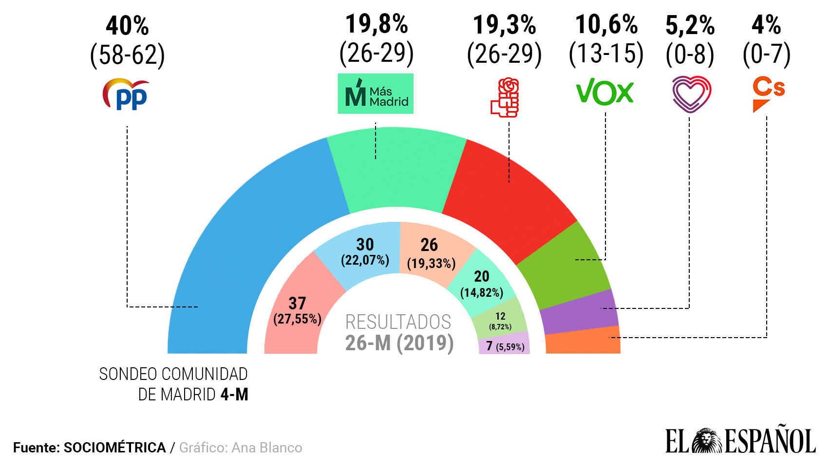 El PP encapçalat per Isabel Díaz Ayuso seria el partit més votat, amb entre 62 i 65 escons, seguit del PSOE d’Ángel Gabilondo, que obtindria entre 25-28 escons; Más Madrid sumaria entre 21-24 escons, Vox es mantindria amb 12-14 diputats i Podemos sumaria 10 o 11 diputats. Per la seva part, Ciudadanos fracassa estrepitosament i no aconseguiria el 5% dels vots necessaris per tenir representació a l’Assemblea de Madrid.