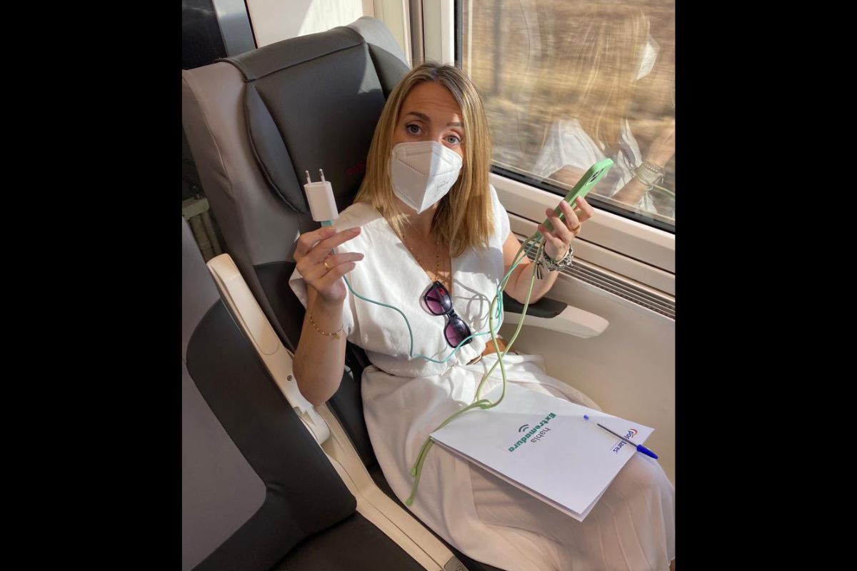 Ya por aquí en ruta. Os cuento: En este tren de “altas prestaciones”, así nos lo vendieron @Renfe y @sanchezcastejon, no hay ni enchufes para cargar los dispositivos y el wifi va a pedales. Por lo menos, de momento, sí funciona el aire acondicionado. #HablaExtremadura pic.twitter.com/0zOTCtzZXy