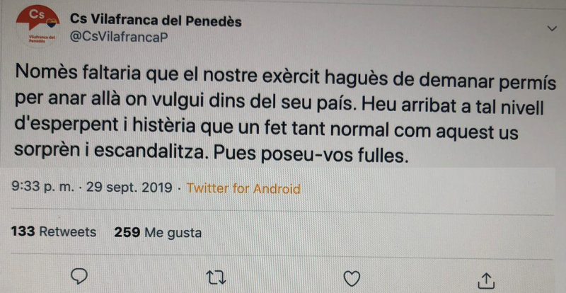 Però la polèmica presència de la legión amb aquesta vergonyant actitud encara segueix. Tal com ha pogut captar diario16.es, el partit ultra de Ciudadanos de Vilafranca va fer un tuit (que ara ha esborrat) celebrant la presència de militars armats bevent alcohol pels carrers del poble.