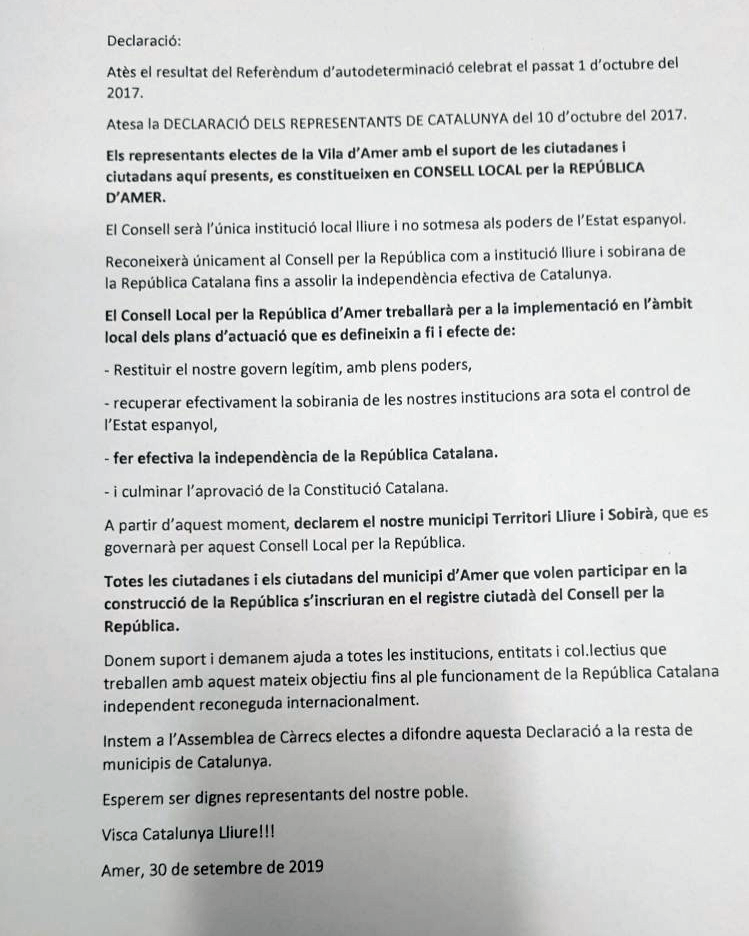 El poble gironí de la família Puigdemont, Amer, s’ha declarat avui “territori lliure no sotmès als poders de l’Estat espanyol”.