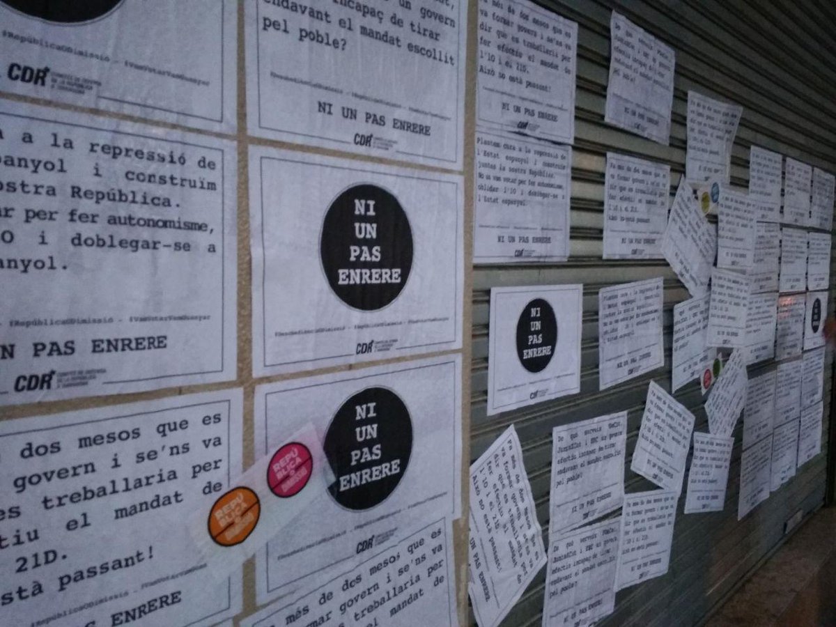 El CDR de Tarragona ha empaperat aquesta nit les portes de les seus del PDeCAT, ERC i la CUP sota el pretext que “vam defensar les escoles més de 48h, amb cos i ànima. Ens van apallissar i vam continuar defensant-les. Ens persegueixen, ens denuncien, passem pels jutjats dia si dia també…”.