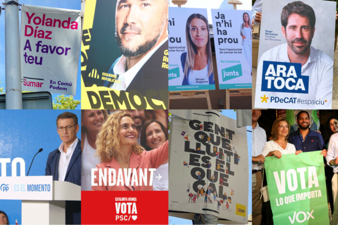 ERC aposta per ‘Defensa Catalunya’ davant l’espantall de l’auge de la dreta i l’extrema dreta. Comuns (‘A favor teu’) i PSC (‘Endavant. Catalunya avança’) utilitzen eslògans en positiu per contraposar-se a un eventual eix de dretes. Per la seva banda, el PP personalitza l’eslògan en el candidat Alberto Núñez Feijóo (‘És el moment’) i Vox opta per ‘Vota el que importa’. PP i Vox no tenen eslògan ni cartell propi per a Catalunya.
