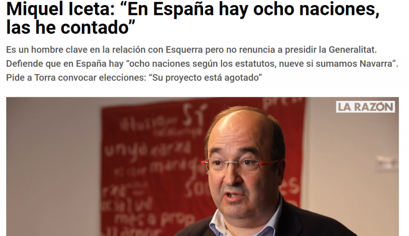 Iceta, en una entrevista al diari ultra La Razón, ha hagut de fer malabarismes per a justificar que Catalunya és una nació i ha tornat a introduir un “cafè per a tots”. Si bé la Constitución reconeix tres regions històriques, catalans, bascos i gallecs, Iceta ha assegurat que a l’Estat hi ha fins a 8 nacions i que “les ha comptat”.