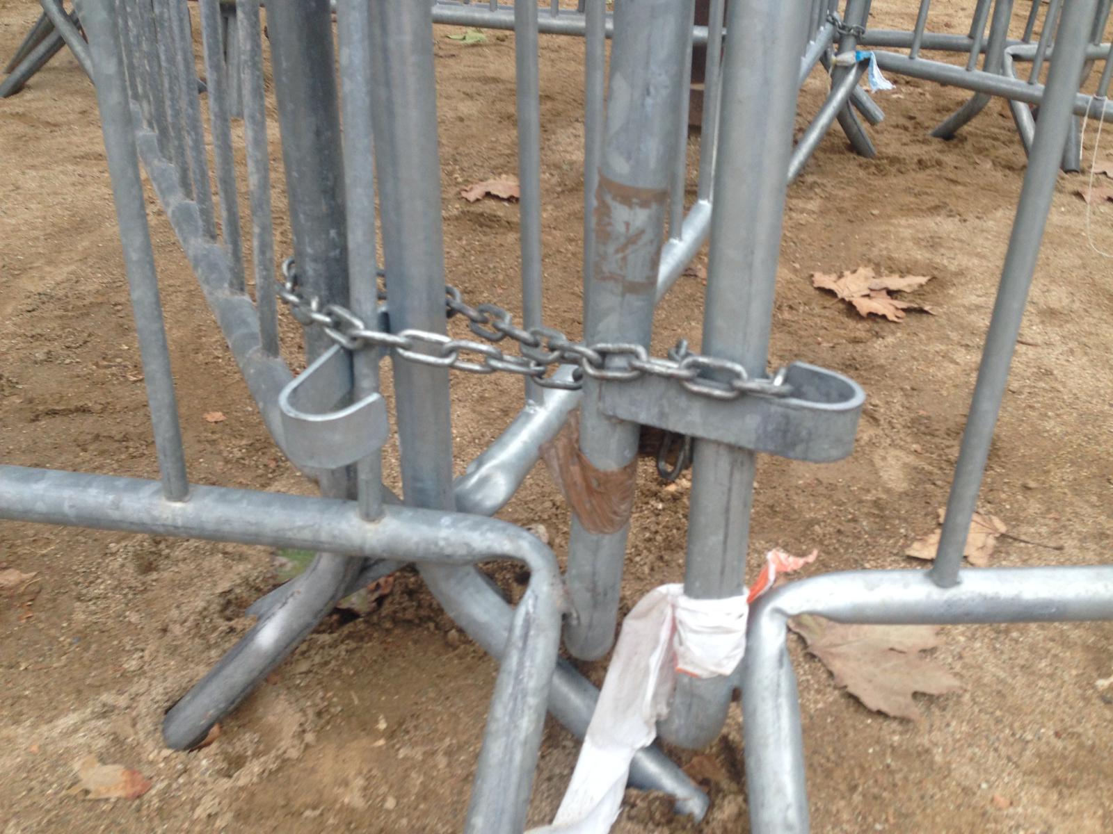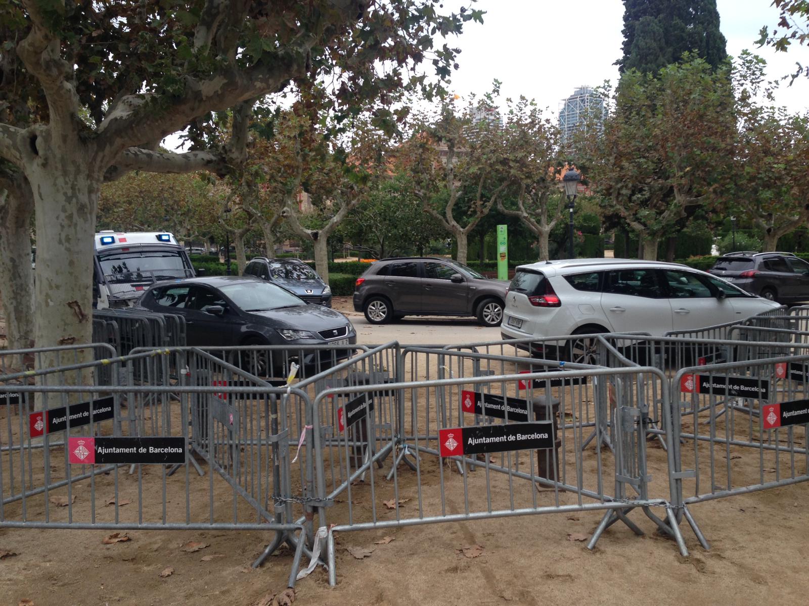 L’extens perímetre que tanca els accessos al Parlament no deixa passar a partir del parc de la Ciutadella. De fet, per entendre’ns, no es pot accedir ni a la plaça enjardinada de Joan Fiveller, on hi ha l’estàtua de Llimona. Les tanques, a més, estan amarrades amb cadenes fent encara més indestructible el fortí.