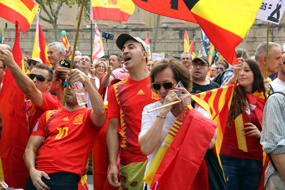 La marxa per la unitat d’Espanya que ha recorregut aquest diumenge el centre de Barcelona ha tornat a oferir les imatges d’exaltació feixista que ens té acostumats/des. A dos dies de la Diada i amb un clar avís al president del govern espanyol, Pedro Sánchez: “Res de pactes amb terroristes ni separatistes”, la manifestació convocada i sufragada per l’empresari José Manuel Opazo amb el suport del partit ultradretà Vox i fins a 60 associacions i moviments com Convivència Cívica Catalana, l’Associació Catalana de Víctimes del Terrorisme, Empresaris de Catalunya o Somatemps, ha reunit unes 2.000 persones –segons xifres de la Guàrdia Urbana- amb lemes contra l’independentisme.