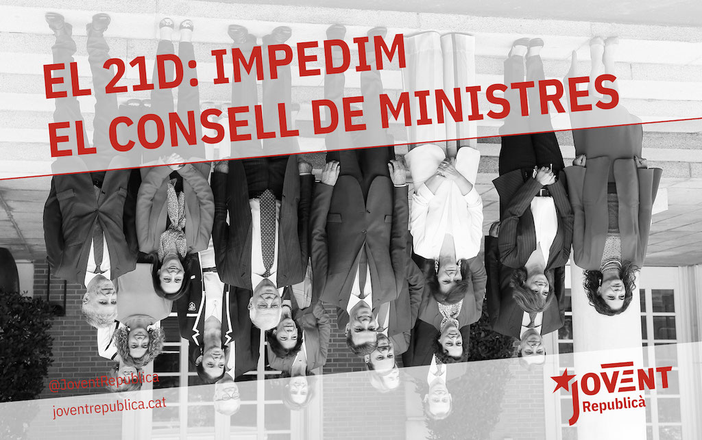 Contundent comunicat de les joventuts d’Esquerra Republicana de Catalunya per fer front al Consell de Ministres. Sota el títol de “plantem cara al Consell de Ministres del 21D”, Jovent considera que la reunió de divendres vinent és un fet “repugnant” i una “provocació” de les forces de l’Estat. Per aquest motiu, Jovent Republicà aposta per plantar cara de forma “massiva i organitzada” per deixar clar que els poders de l’Estat “no són benvinguts”.