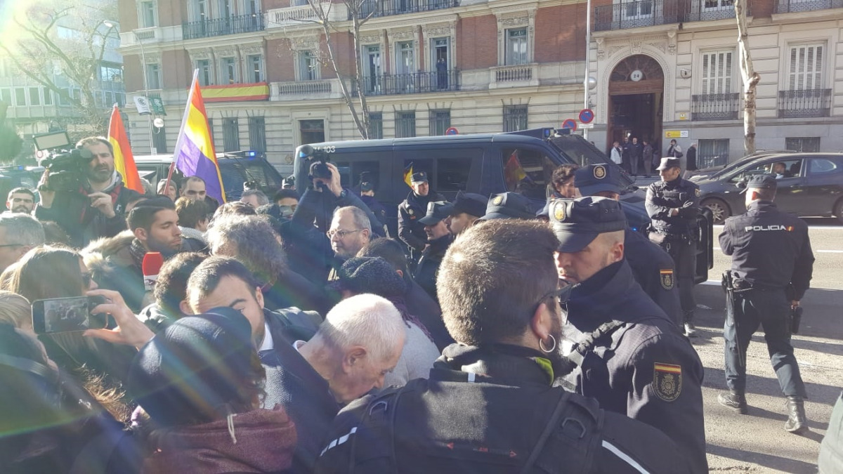 Mentrestant, a l’altra banda de Gènova, més a prop del Tribunal Suprem, hi havia organitzada una concentració espanyolista, amb diverses banderes de caràcter falangista. L’intercanvi de crits ha estat instantani. Han arrencat els unionistes, reblant “separatistas terroristas”, “Torra y Puigdemont, a prisión” i “no nos engañan Catalunya es Espanya”. La resposta de l’independentisme, limitar-se a demanar la llibertat dels presos polítics. Les concentracions, però, no s’han trobat en cap moment gràcies a un gran dispositiu policial, que ha arribat a tallar el carrer per evitar situacions de més tensió.