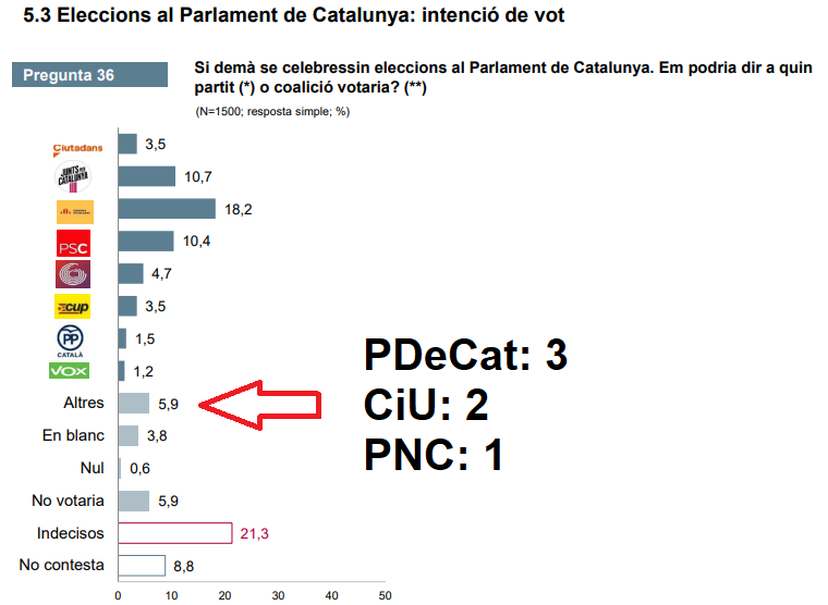 Al punt 5.3 de l’enquesta del CEO, sobre les eleccions, a la pregunta sobre quin partit es votaria si les eleccions fossin l’endemà, hi apareix un resultat agrupat sota el nom “altres”. Si ens fixem amb les dades en brut que ofereix el CEO hi trobarem que dins d’aquest “altres” hi ha 3 persones que han dit que votarien al PDeCat i només 1 sola que votaria al PNC. També hi ha dues persones que votarien la inexistent “CiU”.