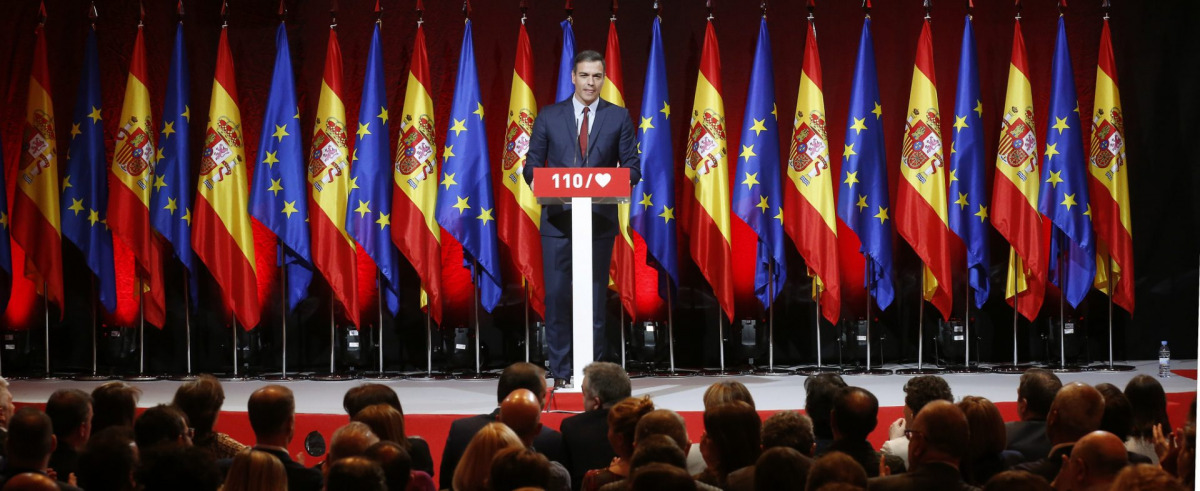 En l’acte de presentació dels 110 compromisos que planteja el PSOE per guanyar les eleccions els socialistes van preparar una escenografia marcadament nacionalista amb un Pedro Sánchez envoltat de banderes espanyoles i europees que recorden les posades en escena de l’extrema dreta espanyola.