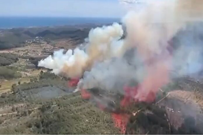 A #IFBonastre hi treballem amb 44 dotacions #Bomberscat 6 d’elles aèries #MAER El foc avança en direcció nord-oest pic.twitter.com/pqAlxbwipP