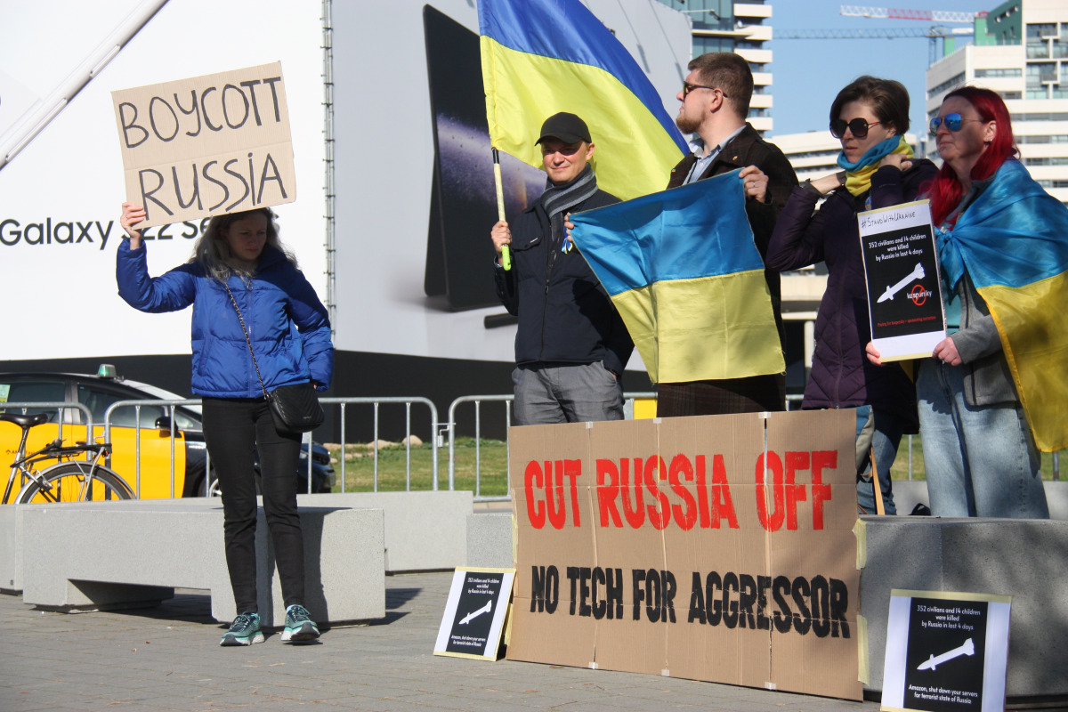 Els participants a la protesta demanen “desconnectar” Rússia, tal com es llegeix en una de les pancartes que han mostrat des de primera hora d’aquest dimarts, quan el congrés de telefonia mòbil i noves tecnologies ha obert portes. Els concentrats han rebut els centenars d’assistents que començaven a arribar al recinte firal de Gran Via al crit de “Stop Puntin”, “No tecnologia per a Rússia” i “Els diners russos maten”.