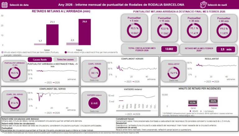 Semblava que Renfe deixaria al fons del calaix els informes de puntualitat del servei de Rodalies, igual que ha fet amb l’escàndol dels maquinistes que falsegen justificants mèdics per no anar a treballar, però finalment la companyiia s’ha decidit a publicar les dades sobre la puntualitat de Rodalies referents als mesos de gener i febrer. Uns informes en els quals Renfe ha fet mans i mànigues per tal de vendre una aparent normalitat i un compliment del servei que, en realitat, no s’estan produint, doncs Rodalies acumula retards, cancel·lacions i tota mena d’interrupcions del servei des de principis d’any, agreuats des de l’accident mortal de Gelida de finals de gener. Precisament, l’informe de puntualitat del mes de gener constata el col·lapse de la xarxa ferroviària, mentre que l’informe de febrer confirma la degradació del servei, de la quals els usuaris i usuàries feia mesos que alertaven. Com era d’esperar, però, Renfe intenta blanquejar les desastroses xifres fent una diferenciació entre les incidències provocades per la pròpia Renfe, les quals situen en un percentatge molt baix, i les incidències provocades per causes externes (és a dir, les que són responsabilitat d’Adif, o les que es deuen a fenòmens meteorològics), les quals ocupen quasi tot el gràfic. Tanmateix, el que deixa clar és que ni unes ni altres li mereixen la més mínima preocupació.