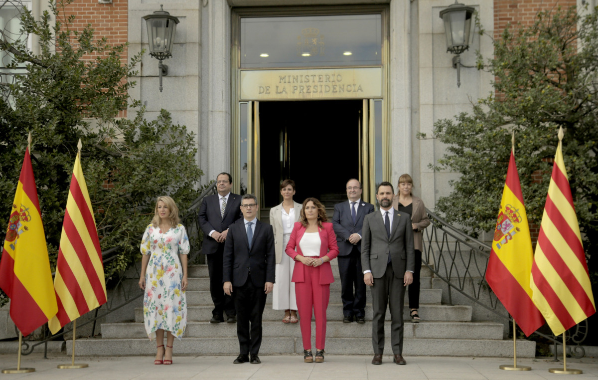 La tercera reunió de la taula de diàleg ja ha començat. Els i les representants de la Generalitat i la Moncloa es reuneixen des d’aquest dimecres a les 10 hores al Ministeri de la Presidència, en la represa de les negociacions entre els dos executius. El Govern el representen la consellera Laura Vilagrà i el conseller Roger Torrent -els dos noms fixes-, i s’hi han sumat Joan Ignasi Elena i Natàlia Garriga. El govern espanyol repetirà la delegació, formada per Félix Bolaños, Yolanda Díaz, Miquel Iceta i Isabel Rodríguez. De la reunió s’espera que en pugui sortir un document per rubricar els “acords”. Després de la trobada, Vilagrà i Bolaños atendran la premsa, per separat.