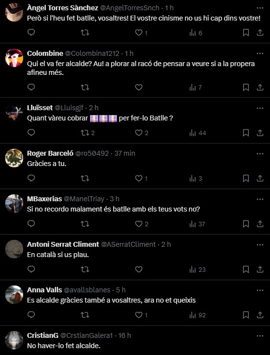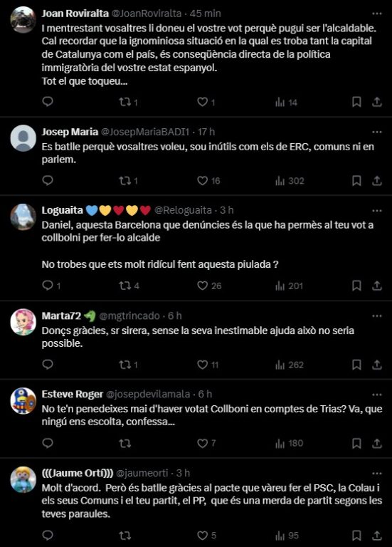 Sirera ha escrit a Twitter: “Barcelona insegura i degradada: 1.500 persones sense sostre, 260 robatoris al dia, 226 furts diaris, i Collboni es llança a gestionar un districte 11… a Gaza i Palestina. Màxim postureig, màxima incompetència”. Ràpidament, però, les respostes a aquest escrit a Twitter s’han omplert de missatges recriminatoris. Un usuari respon que “Trias era millor alcalde, i el Procés no hauria d’haver afectat mai les decisions locals”, comentari que Sirera respon al·legant que “però van afectar, i Trias va prioritzar un pacte separatista amb ERC (5 regidors) a un de dretes amb el PP (4 regidors). “Molt bé. Reconeixes que és més important la unitat d’Espanya que la qualitat de vida de la gent que viu a la ciutat. Gràcies, molt aclaridor que admetis que ets un fanàtic ultranacionalista” respon un altre usuari, al qual Sirera li continua insistint que va ser Trias qui no va voler el suport dels populars. “L’únic motiu que dones és que són separatistes, demostrant que t’importa un rave el benestar dels ciutadans, l’únic que et preocupa és la bandereta” afegeix el mateix usuari. Altres crítiques que ha rebut Sirera per hipòcrita són aquestes: