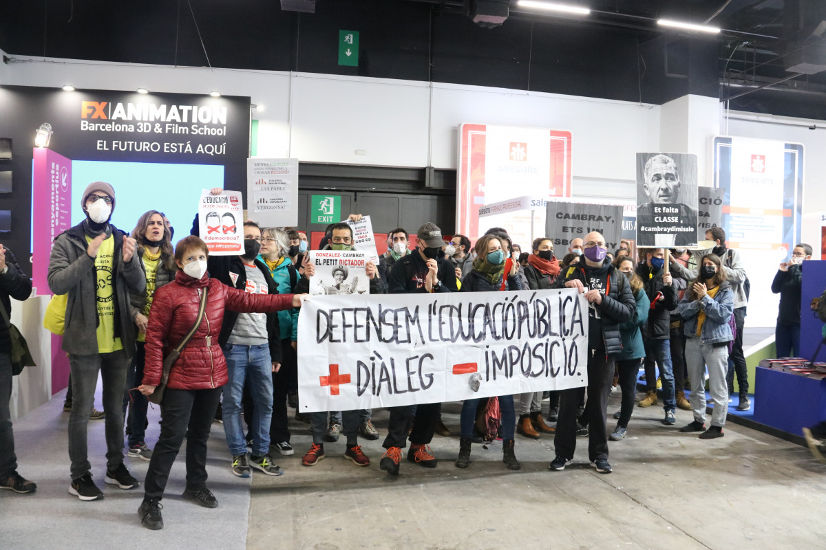 Una cinquantena de docents han entrat aquest dimecres al Saló de l’Ensenyament de Barcelona, on està previst que compareguin el conseller d’Educació, Josep González Cambray, juntament amb la consellera de Recerca i Universitats, Gemma Geis. Els manifestants han entrat per la porta d’accés principal amb pancartes i xiulets en el marc de la segona jornada de la vaga educativa. Entre les proclames principals, demanen la dimissió del conseller per les seves polítiques i exigeixen al president del Govern, Pere Aragonès, que intervingui en el conflicte.
