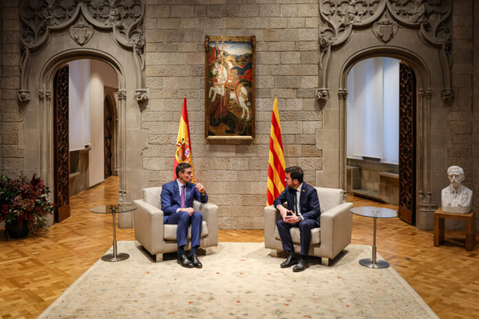 La reunió entre el president del Govern, Pere Aragonès, i el cap de l’executiu espanyol, Pedro Sánchez, ha arrencat aquest dijous amb uns 30 minuts de retard. Tots dos presidents s’han trobat al Palau de la Generalitat en la que és la seva primera reunió institucional després de la investidura i els pactes que l’han permesa. Aragonès i Sánchez han estat rebuts a la plaça Sant Jaume per desenes de manifestants de l’Assemblea Nacional Catalana, que protestaven contra la trobada i contra la presència de Sánchez a Barcelona precisament en el sisè aniversari de l’aplicació del 155 a Catalunya.
