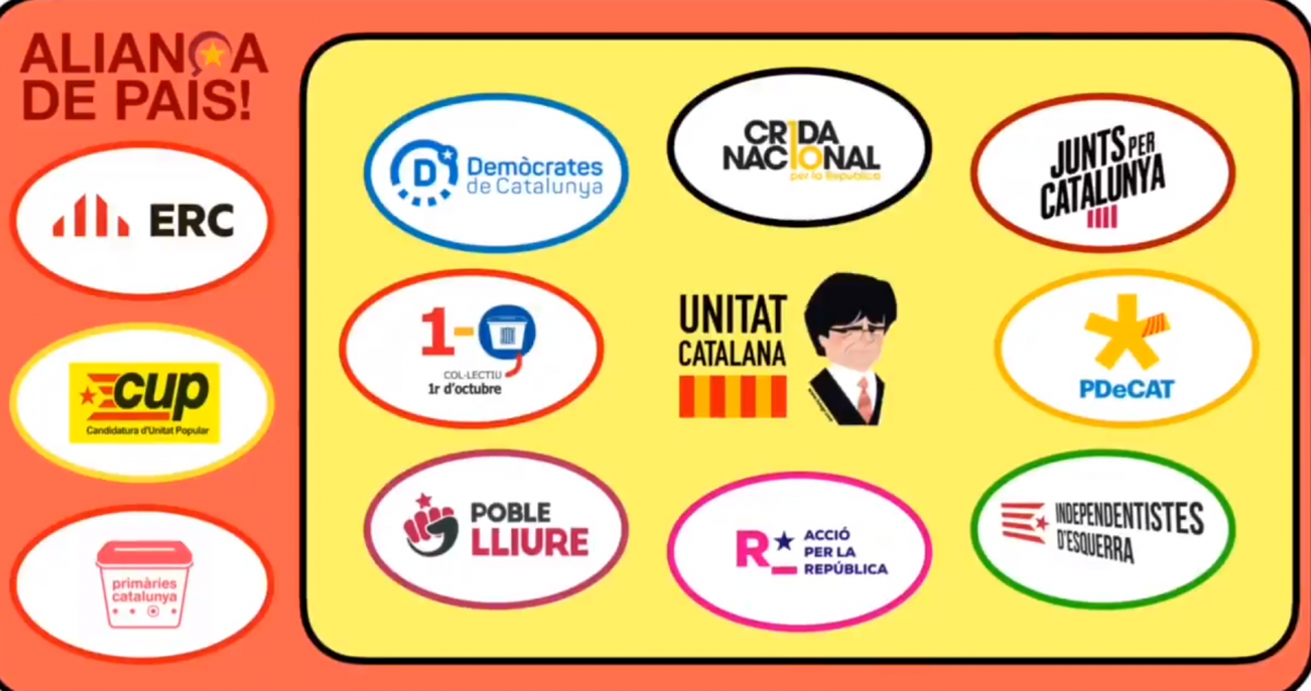 En les últimes hores s’ha fet viral a la xarxa un vídeo que mostra, a través d’un esquema amb Puigdemont com a eix central, es pot arribar a assolir la independència de Catalunya a través d’una gran aliança de país. El vídeo l’ha compartit l’usuari de Twitter Salvador Vergés, i representa un esquema de com està el panorama actual d’aliances entre partits polítics independentistes, que només amb el fet que la figura de Carles Puigdemont es desvinculés directament del PDeCat, es podria crear el que s’anomena “Unitat Catalana”, amb partits com JxCat, La Crida, Independentistes d’Esquerra o Poble Lliure guiats pel president. El següent pas seria crear l'”Aliança de País” juntament amb ERC i la CUP.