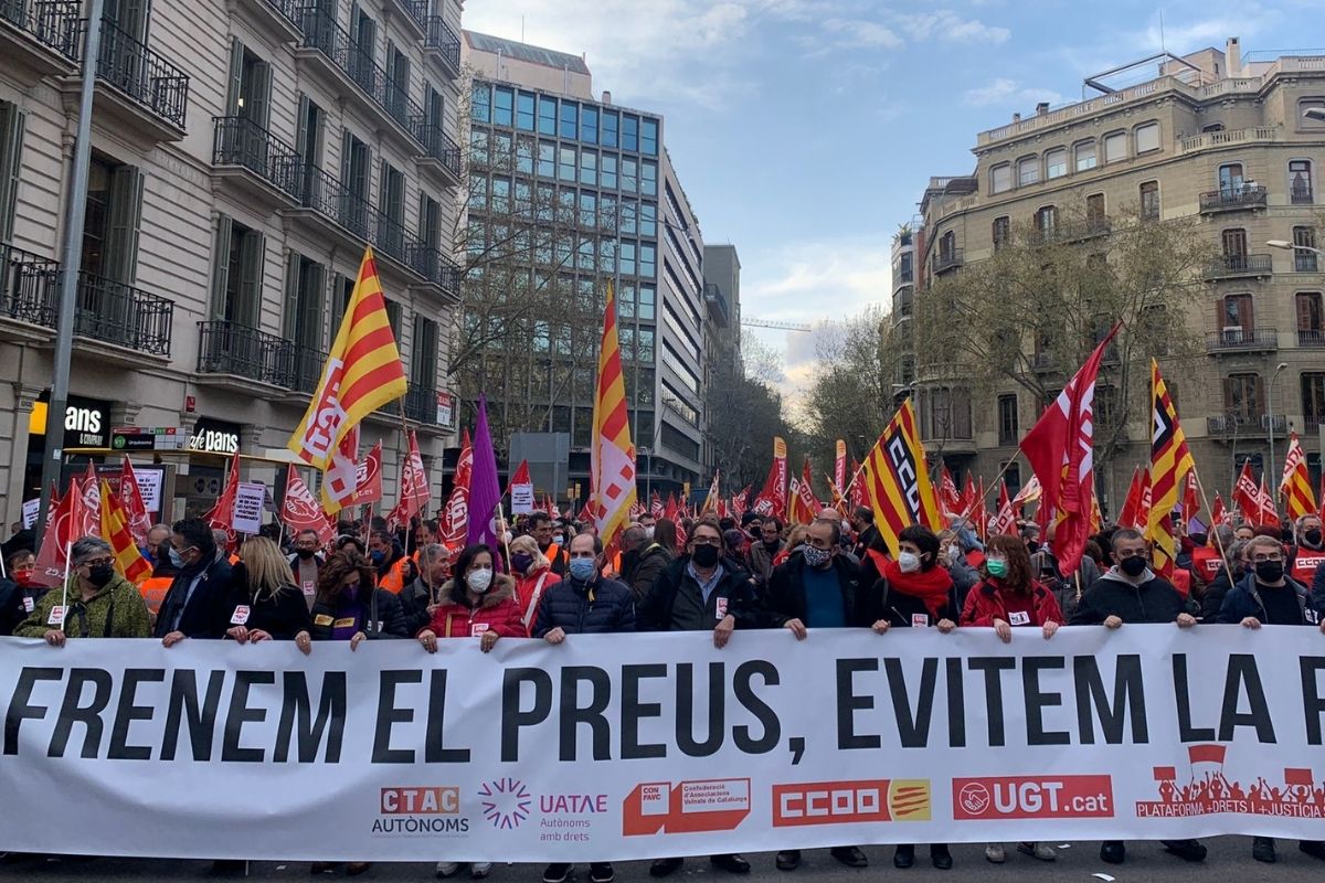Un miler de persones s’han mobilitzat a Barcelona per reclamar el control de preus de l’energia en una manifestació convocada pels sindicats majoritaris, CCOO i UGT, la confederació veïnal CONFAVC i les organitzacions d’autònoms CTAC i Uatae. Sota el lema ‘Frenem els preus. Evitem la pobresa’, la marxa ha sortit de plaça Urquinaona i ha continuat per la Via Laietana fins a plaça Sant Jaume per reclamar el control de preus i la reforma “urgent” del mercat energètic davant l’alça de preus. A més, han reclamat que s’impulsi la transició energètica cap a les renovables, que es tirin endavant mesures fiscals equitatives que augmentin l’aportació de rendes mes altes i s’equipari el preu del gasoil professional als petits transportistes autònoms.
