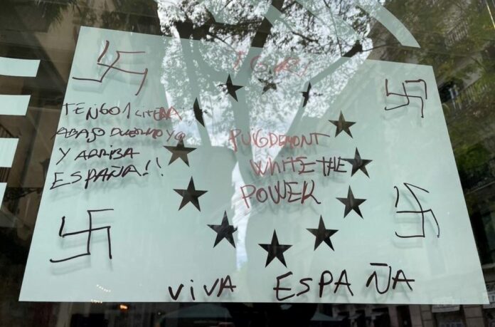 Some Spanish fascists attacked our MEP office in Barcelona, painting Nazi symbols and claiming “white power”. We have reported this to the police, although we have no hope that Spanish “justice” will punish those responsible, as always happens when the aggressors are Spanish… pic.twitter.com/un9NFLKAoR