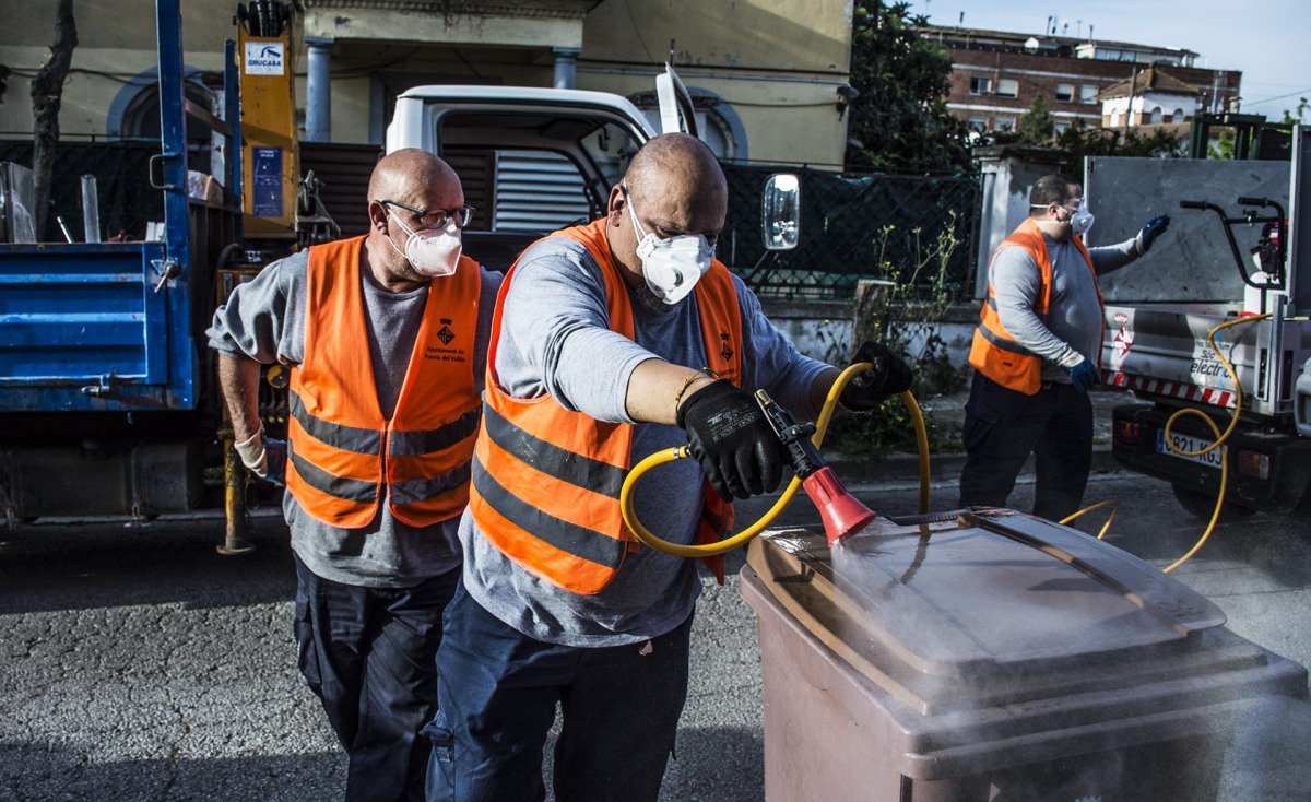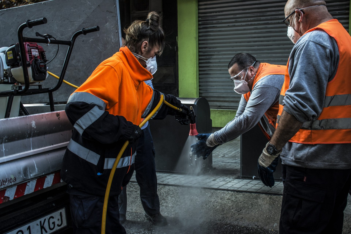 Fotos i reportatge: @FotografaRoque @paularoquefoto .- Molts d’ells conviuen amb persones de risc i encara i així surten cada dia als carrers per garantir el benestar de tots. La seva feina consisteix en polvoritzar un compost d’aigua i clor als contenidors, ja que, són una de les zones de més risc d’infecció.