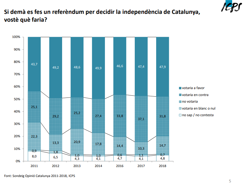 Un nou estudi afirma que si es fes un referèndum el ‘Sí’ guanyaria amb diferència. L’informe, publicat anualment, ha estat elaborat per l’Institut de Ciències Polítiques i Socials (ICPS), adscrit a la Universitat Autònoma de Barcelona, ha entrevistat a 1.200 persones sobre les relacions entre Catalunya i Espanya.