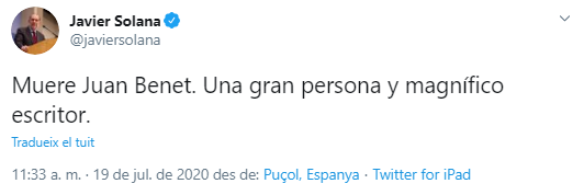 Solana ha patinat greument i ha confós Juan Marsé amb Juan Benet, un escriptor madrileny que va morir el 5 de gener de 1993, ara fa més de 27 anys. Després de dues hores des de la seva publicació, el tuit segueix visible: