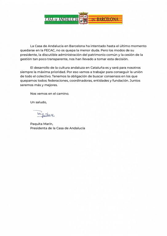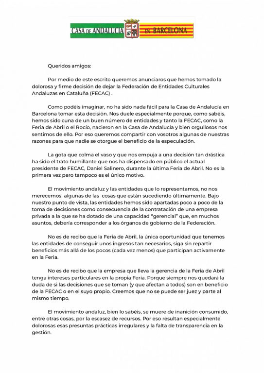 En un comunicat, Casa de Andalucía en Barcelona ha exposat els motius pels quals una forta entitat de l’àmbit, que de fet va fer néixer la FECAC, els abandona ara. La seva presidenta, Paquita Marín, ha denunciat el nefast tracte que han rebut per part del president de FECAC, Daniel Salinero, durant la celebració de l’última Feria a Barcelona. A més, també assegura que, a poc a poc, les entitats que formaven part de la FECAC han estat “apartades” de la presa de decisons perquè entre els draps bruts de la FECAC hi ha la contractació d’una empresa privada que s’encarrega de funcions que haurien de tenir des de la Casa de Andalucía i altres espais.