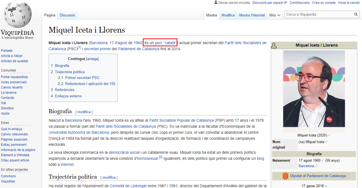 Doncs recentment algú ha boicotejat l’entrada del socialista i líder del PSC Miquel Iceta. Tot just a l’inici de l’article en català, la Viquipèdia assegura que “és un porc català”. Ara per ara, és ben visible, no sabem què tardaran altres usuaris a esmenar-ho. Sigui com sigui, aquí hi ha la captura: