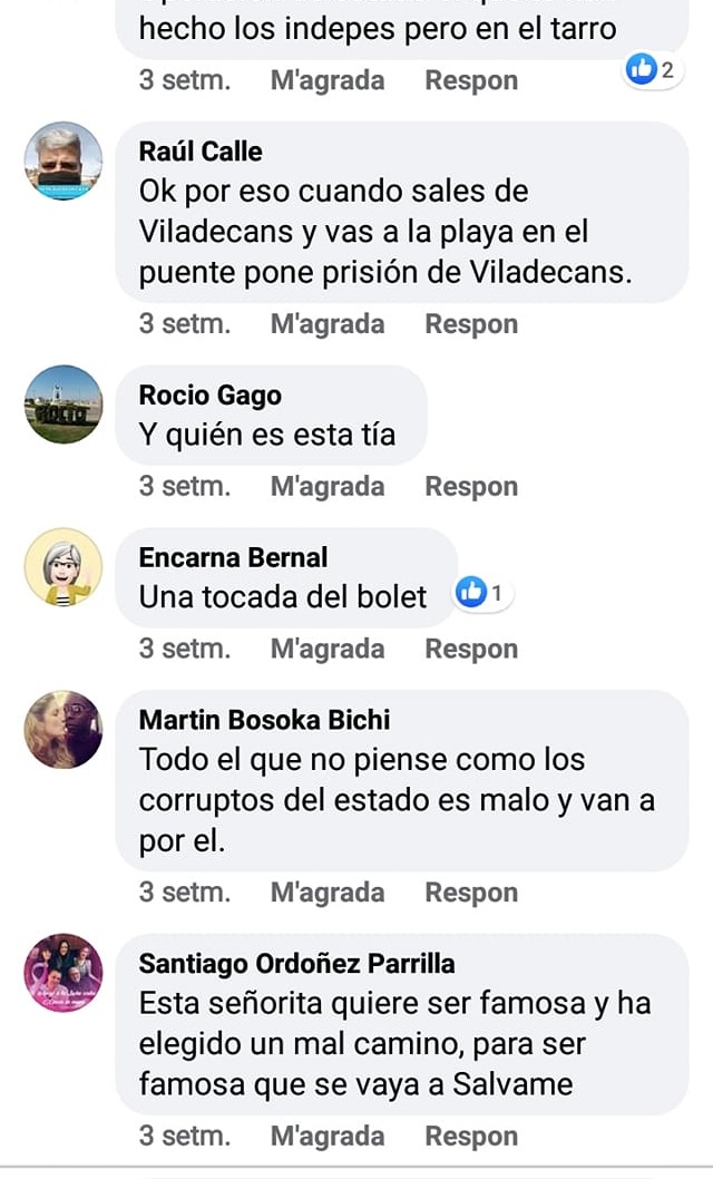 Evidentment, tots els perfils que carreguen impunement contra la Tamara són descaradament unionistes. “Tothom s’empara en l’anonimat per fer mal o per fer-se l’orni i permetre-ho” explica la represaliada en el mateix text. A més, detalla que “és així cada dia”.