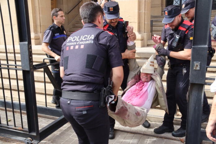 Posteriorment, els manifestants s’han tacat amb pintura vermella simulant sang i dos d’ells han estat retirats de les instal·lacions del Ministeri pels Mossos. L’organització ha denunciat que tant el president del govern espanyol, Pedro Sánchez, com la ministra de Defensa, Margarita Robles, “s’estan passant la pilota” i no donen resposta a cap de les seves peticions.