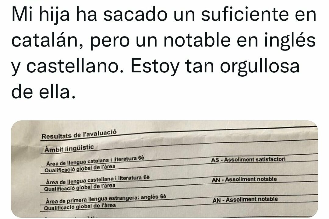 La piulada ha estat molt criticada, però sobretot ha remarcat un fet que Espanya nega: Cal reforçar la immersió lingüística en lloc de parlar de percentatge de castellà. De fet, la mateixa usuària ha canviat el tuit després d’encendre la polèmica, dient que la seva filla ha tret un suficient en català “i a la resta d’assignatures, notables i excel·lents”.