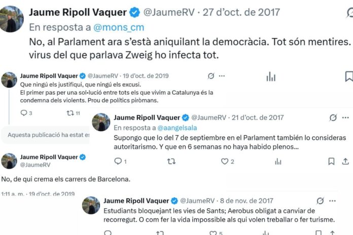 El dia 27-O, quan el Parlament va declarar la independència simbòlica i poc després el Govern espanyol va segrestar el Govern de la Generalitat amb el 155, Ripoll va defensar la Constitució espanyola a la vegada que acusava els líders independentistes de mentir i d’haver perdut la decència. Ja entrant al mes de novembre, amb la vaga general contra les detencions dels consellers i dels activistes, el cofundador de Filmin va criticar els manifestants que bloquejaven el país amb el següent missatge: “Poques coses em provoquen més tristesa que veure nens petits a manifestacions, bandera en mà. Inocular odi portarà conseqüències funestes”. Dos anys després, el 2019, amb les protestes ciutadanes contra la sentència del Procés, Ripoll va piular: “Que ningú els justifiqui, que ningú els excusi. El primer pas per una sol·lució entre tots els que vivim a Catalunya és la condemna dels violents. Prou de polítics piròmans”.