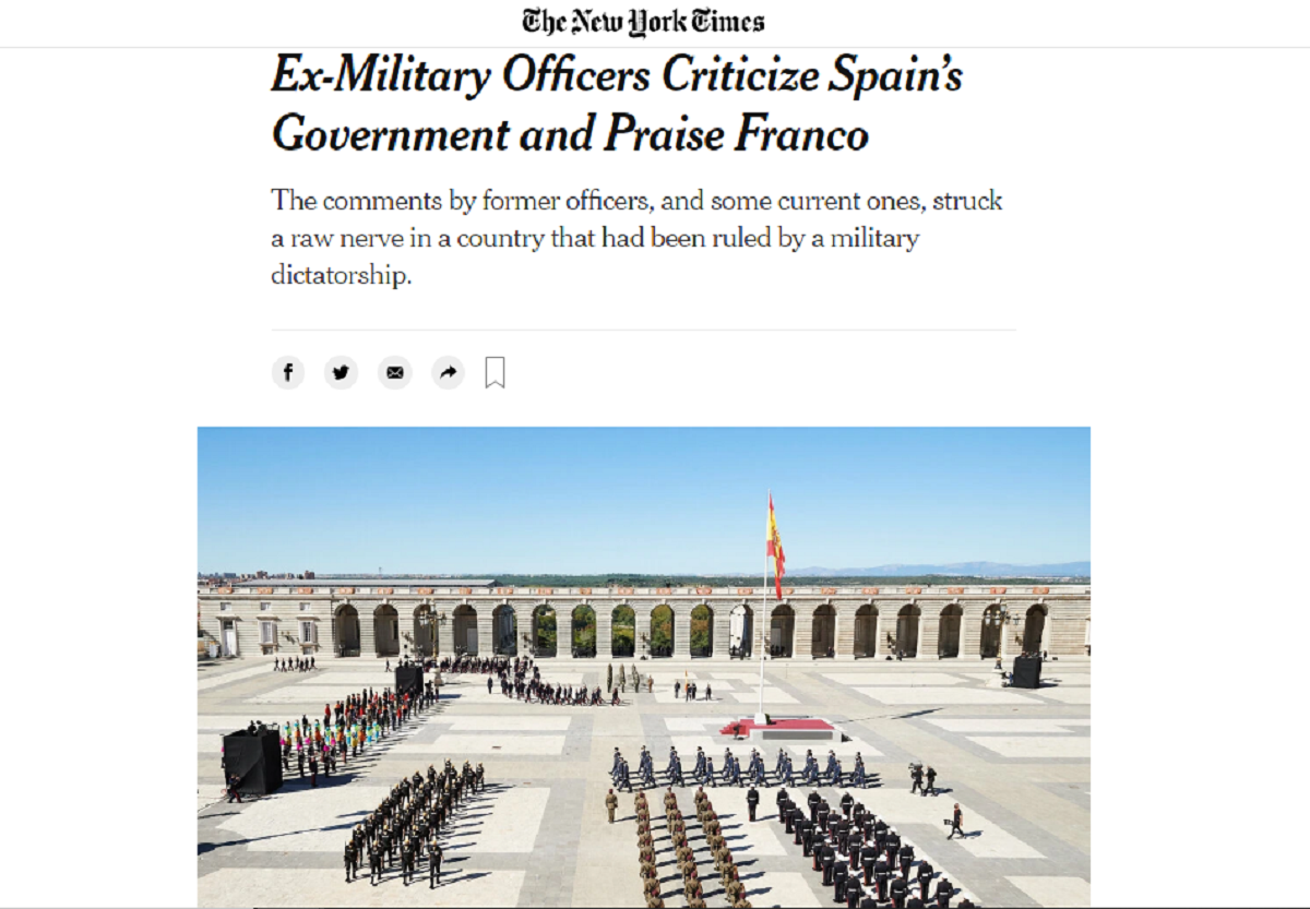 Ni més ni menys que el reputat The New York Times dedica tot un article a explicar el deix franquista i d’ultradreta que hi ha a les forces armades espanyoles en ple segle XXI i la seva impunitat.
