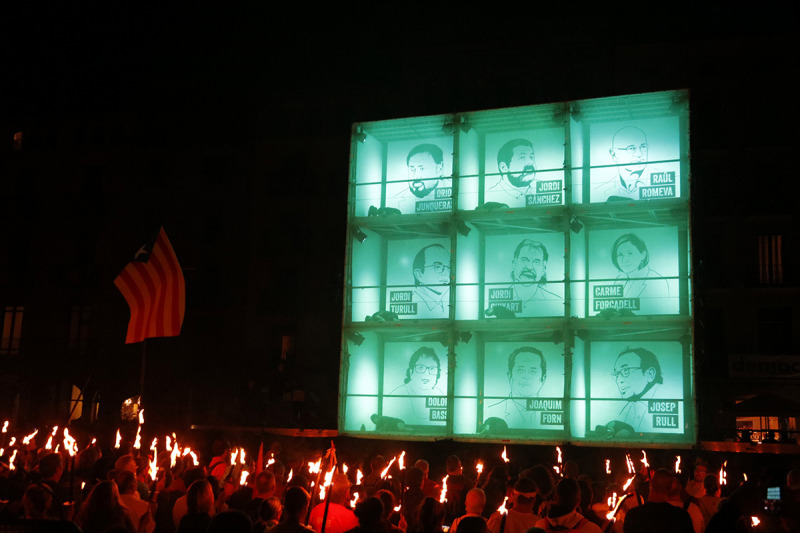 La dissetena Marxa dels Vigatans s’ha iniciat amb l’arribada de les 36 columnes de foc des dels diversos pobles d’Osona. Amb el foc envaint la plaça Major i abans dels parlaments, l’acte no ha oblidat als presos polítics i als exiliats. Primer a través de les projeccions i, seguidament, pels mateixos protagonistes.