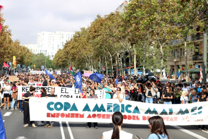 Una manifestació ha recorregut part del front marítim barceloní aquest diumenge al migdia contra la Copa Amèrica de Vela i per reclamar que la ciutat no torni a acollir un esdeveniment d’aquestes característiques. Sota el lema ‘Copa Amèrica Mai Més’, els manifestats, 2.000 segons la Guàrdia Urbana i 6.000 segons els organitzadors, han marxat de la plaça de Correus al mirador del camp de regates, al final del carrer Marina. ‘Els vostres velers ens pugen els lloguers’, ‘Collboni, torna’ns els diners’ o ‘Visca, visca, visca, la lluita de les veïnes’, han estat algunes de les proclames que s’han sentit. Els manifestants han criticat la inversió pública en l’esdeveniment, la massificació turística i han reivindicat que la ciutat “no es ven”.