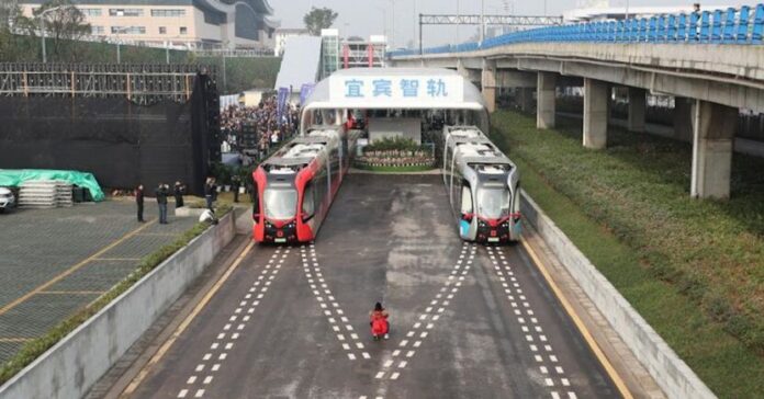Tren que circula por la carretera SIN RIELES ya está en plena marcha.Tecnología de transporte inteligente que deja al mundo sorprendido. pic.twitter.com/cLFNOnyhTC