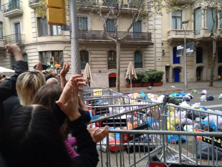 Els manifestants han deixat un corredor enmig de la protesta perquè la gent, a mida que va arribant a la zona, pugui llançar la brossa dins del cordó policial, on ja s’apilen centenars de bosses.