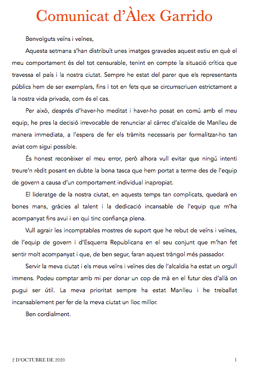 Garrido sí ha explicat que la renúncia es farà efectiva a partir de dilluns, quan començaran els tràmits per tirar endavant la decisió. “És honest reconèixer el meu error, però alhora vull evitar que ningú intenti treure’n rèdit posant en dubte la bona tasca que hem portat a terme des de l’equip de govern a causa d’un comportament individual inapropiat”, ha afegit.