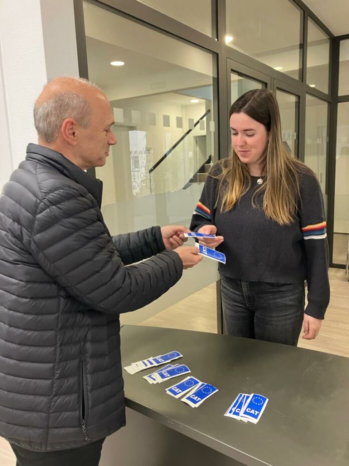 Han repartit 700 adhesius CAT per tapar l’E a les matrícules i l’adhesiu amb un lema històric, “En català, si us plau”, i no descarten augmentar aquest repartiment vist la bona rebuda de la campanya.