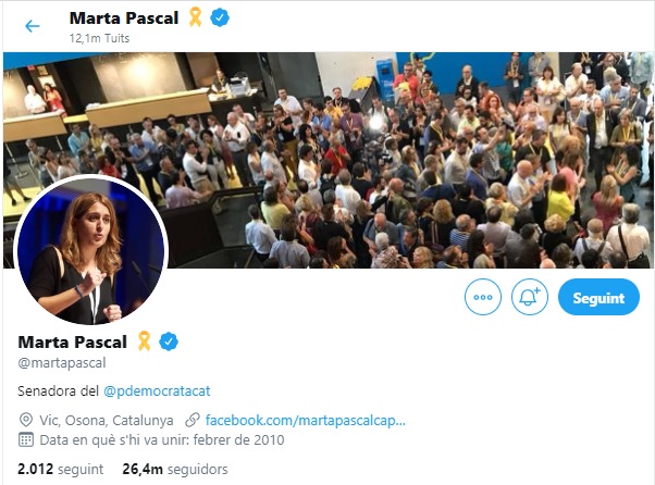 Un detall la delata, en el seu perfil de twitter diu ser senadora del PDECAT, i va ser JxCat qui la va proposar senadora autonòmica, suposo que a hores d’ara deuen pujar-se per les parets al grup parlamentari de JxCat desprès d’escoltar-la ahir al FAQS.