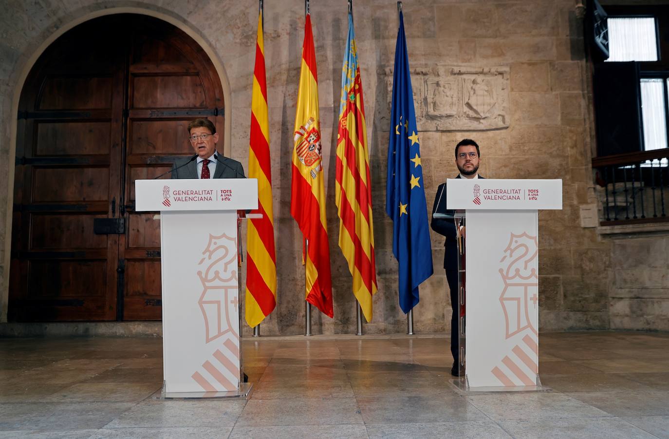 Els presidents de les Generalitats valenciana, Ximo Puig, i catalana, Pere Aragonès, han mantingut una llarga reunió, seguida per una també molt extensa roda de premsa conjunta, al Palau de la Generalitat de València. Del llistat de temes tractats en destaca la creació d’un grup de treball per generar sinergies en la captació d’ajudes europees. Sempre amb la pandèmia com a prioritat a superar, altres temes, a desenvolupar en reunions de treball específiques són les infraestructures, amb el corredor mediterrani com a tema estrella d’aquest apartat, i les energies renovables. El tercer gran àmbit és el de la cultura, amb una nova crida a poder tenir reciprocitat en els canals públics dels dos territoris.