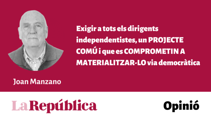 - Exigir!a tots els dirigents independentistes, un PROJECTE COMÚ i que es COMPROMETIN A MATERIALITZAR-LO via democràtica. Els qui no s’uneixin a aquest projecte comú s’autodesqualifiquen, auto eliminen. No haurien de ser votats novament.