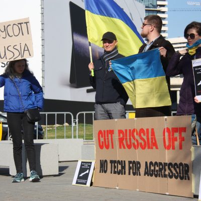 Protesta a les portes del MWC per pressionar les multinacionals a fer “boicot” a Rússia