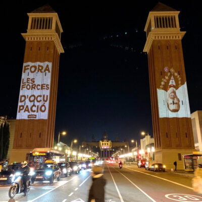 Pengen Felipe VI de cap per avall a les torres venecianes de Plaça Espanya